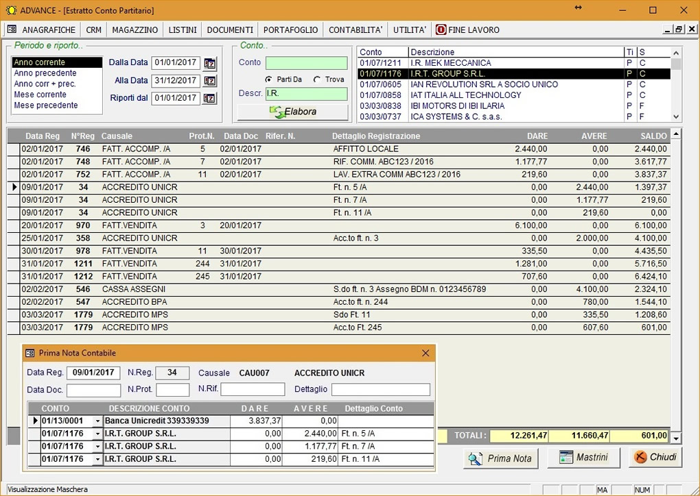 La prima nota in partita doppia è lineare e intuitiva. Impostato i dati di testa (data, causale, protocollo e documento) una fattura va registrata inserendo il totale documento e la parte IVA; Advance fa tutti i controlli e genera la parte contabile in basso.